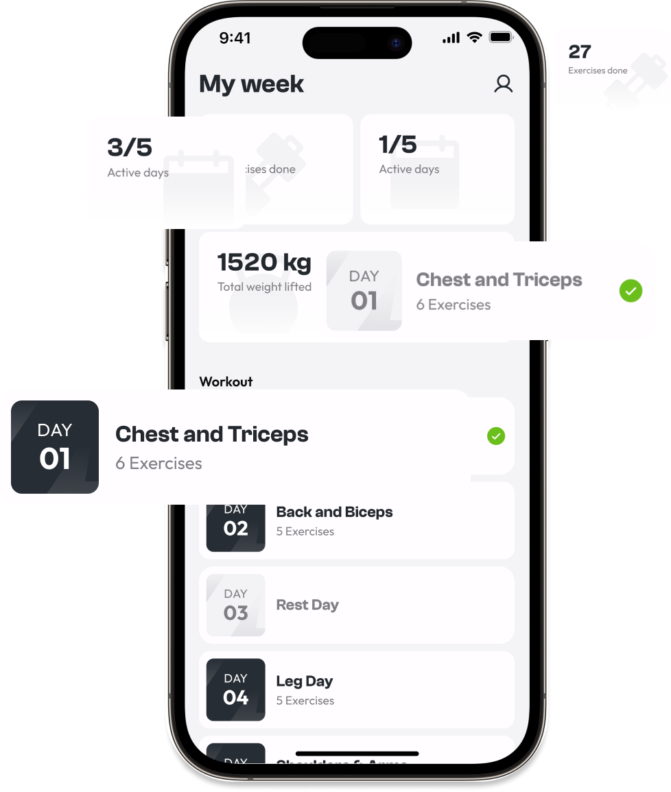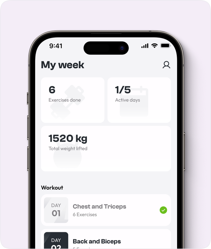 The workout detail page gives you a clear, easy-to-follow view of each exercise, personalized to your goals, with tips and progress tracking for optimal results.